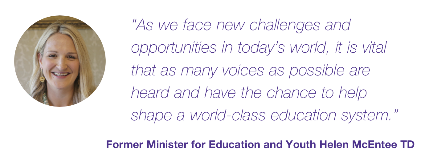 “It will be a truly inclusive process engaging with children, young people and their parents, school communities, education stakeholders, along with other stakeholders from within and outside the education system. All of the views gathered will be of great value in helping to inform and shape education policy now and into the future.”
