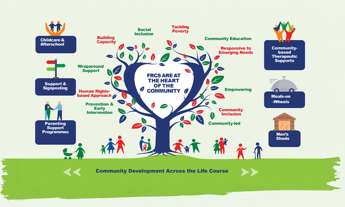Using the core funding managed and administered on government’s behalf by Tusla, each FRC leverages and pools funding streams to deliver developmental opportunities and wrap around supports to the community in a joined-up manner under one roof.