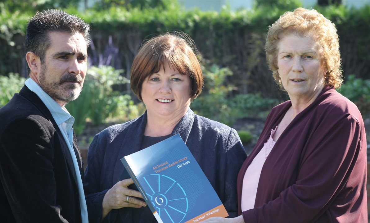 Launch of Our Geels: All Ireland Traveller Health Study (2010): Pavee Point Co-Director, Martin Collins; then-Minister for Health, Mary Harney; Pavee Point Primary Health Care Worker, Missie acCollins.